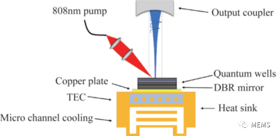 這項研究提出的VECSEL係統由泵浦激光、熱沉及控溫TEC、增益芯片和輸出耦合鏡組成。增益芯片發光區由兩(liang) 組不同發光波長的量子阱組成,其中一組發光波長較短的量子阱采用吸收區泵浦的方式,另一組發光波長較長的量子阱采用阱內(nei) 泵浦方式。VECSEL工作時,增益芯片底部的熱沉溫度通過半導體(ti) 製冷片TEC控製。