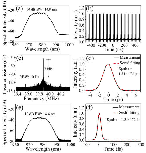 圖2. 978 nm九字腔光纖激光器輸出脈衝(chong) 參數。(a)光譜,(b)脈衝(chong) 序列,(c)射頻譜,(d)自相關(guan) 信號,(e) 腔外壓縮後的頻譜和(f)自相關(guan) 信號。