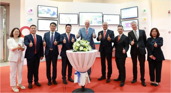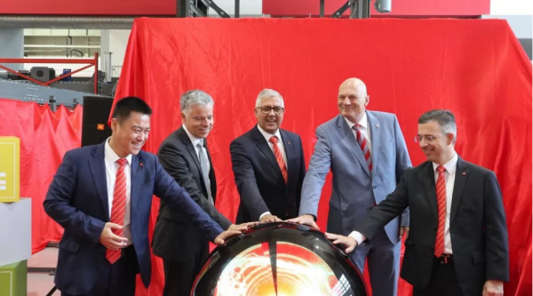 新品揭幕現場合影(從(cong) 左到右:百超集團中國區總裁遊鬆博士、瑞士駐華使館經濟金融與(yu) 商務處主任Martin Matter先生、百超集團全球總裁兼執行官Alex Waser先生、瑞士駐華大使Juerg Burri先生、百超集團全球首席運營官Marco Vinanti先生)