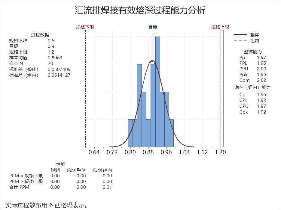 焊接1 係鋁鈀片到方形鋰電池極柱上方,要求表麵外觀無焊渣飛濺、裂紋、氣孔、虛焊等不良現象,焊接熔深達到0.6—1.2mm,熔寬 1.5-2.5mm實際測試20組數據,熔深大都集中在0.7— 1.0之間,過程能力Cpk為(wei) 1.92,滿足焊接實驗要求。
