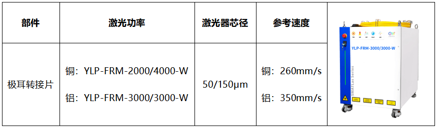 極耳轉接片與(yu) 軟連接是連接電池蓋板與(yu) 電芯的關(guan) 鍵部件。對於(yu) 焊接而言需要考慮到電池的過流強度以及低飛濺的要求,在焊接的過程中需要具備足夠的焊縫寬度,並且需要保證沒有飛濺物落在電芯上。焊接要求達不到或有飛濺物落在電芯上電池在以後的使用過程中極易出現電池短路與(yu) 燒壞的現象。並且轉接片的主要負極材料為(wei) 銅,屬於(yu) 高反材料,在焊接的過程對於(yu) 激光器的能量密度和抗高反能力提出了更高的要求!能量密度不夠焊接效果不達標準電池容易出現短路。
