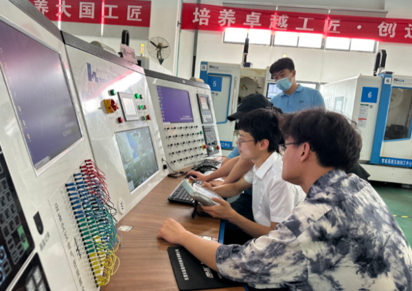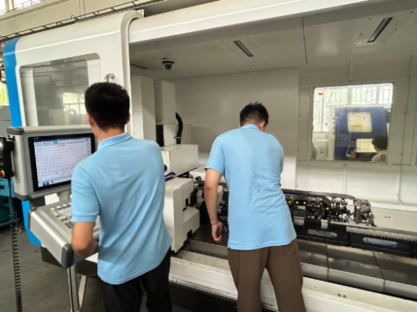 華中數控的工作人員正在操作生產(chan) 冰刀的數控車床。