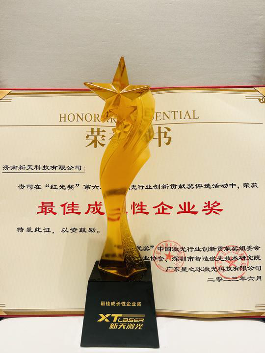 新天激光憑借其銳意進取的企業(ye) 創新活力,激光行業(ye) 的綜合實力及卓越的品牌影響力,從(cong) 全球眾(zhong) 多參選企業(ye) 中脫穎而出,榮獲2023年度第六屆紅光獎“最佳成長性企業(ye) ”榮譽。