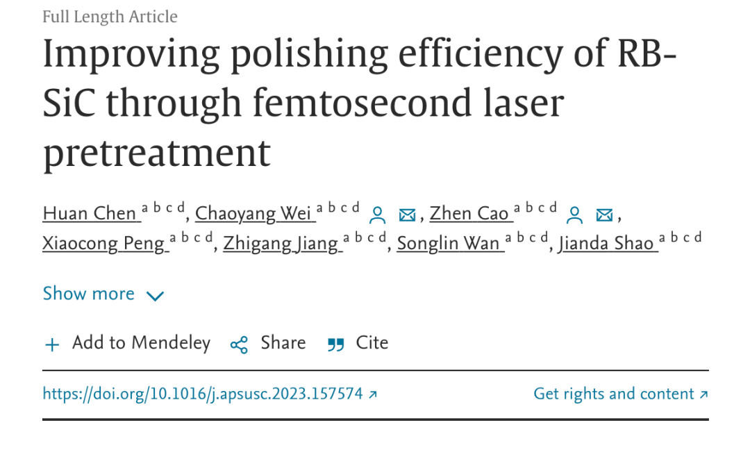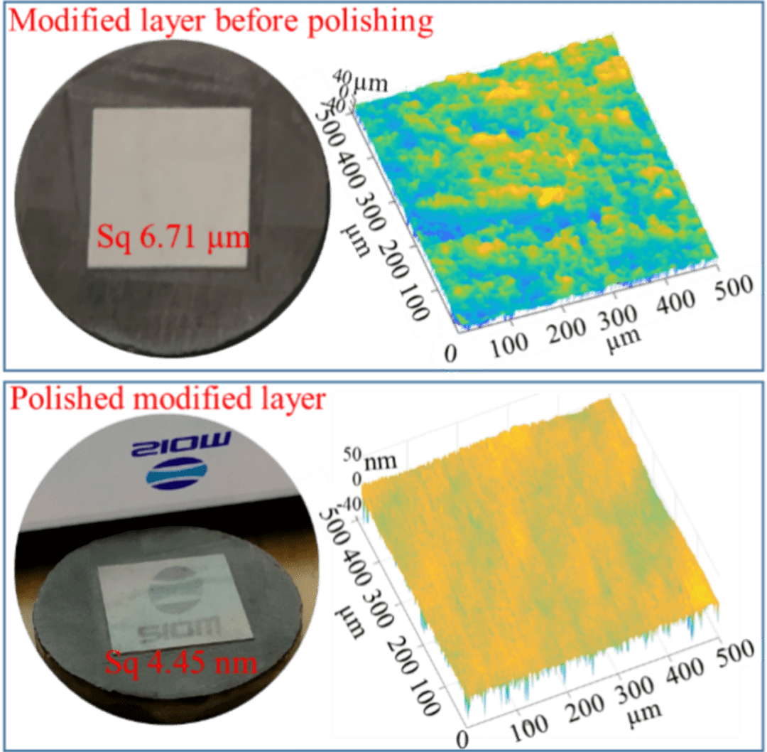 近期,中國科學院上海光學精密機械研究所精密光學製造與(yu) 檢測中心實驗室魏朝陽研究員團隊在碳化矽表麵飛秒激光改性提升拋光效率研究方麵取得進展。研究發現通過飛秒激光對預塗有Si粉的RB-SiC表麵進行改性,能夠獲得結合強度為(wei) 55.46 N的表麵改性層。且改性後的RB-SiC的表麵僅(jin) 經過4.5小時的拋光,即可得到表麵粗糙度Sq 為(wei) 4.45 nm的光學表麵,與(yu) 直接研磨拋光相比,拋光效率提高了3倍以上。該研究成果拓展了RB-SiC的表麵改性方法,並且激光的可控性和該方法的簡單性,使得它可以用於(yu) 複雜輪廓的RB-SiC表麵改性處理。相關(guan) 成果發表在Applied Surface Science(《應用表麵科學》)上。