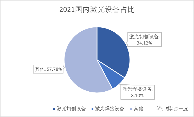 激光在工業(ye) 上的應用主要體(ti) 現在利用激光束與(yu) 物質相互作用的特性對材料進行加工處理,激光加工按激光束對材料的作用效果可劃分為(wei) 激光切割、激光焊接等。根據《2022年fun88官网平台產(chan) 業(ye) 發展報告》的調查數據顯示,2021年我國激光切割設備和激光焊接設備市場銷售收入分別為(wei) 280.1億(yi) 元和66.5億(yi) 元,分別占fun88官网平台設備市場總份額的34.12%和8.10%。