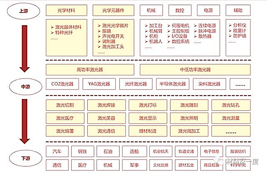 激光器行業(ye) 產(chan) 業(ye) 鏈上遊包括芯片、泵浦管、耦合器等零部件生產(chan) 環節;中遊為(wei) 激光器生產(chan) 供應環節,主要包括氣體(ti) 激光器、光纖激光器和半導體(ti) 激光器、固體(ti) 激光器與(yu) 染料(液體(ti) )激光器;下遊廣泛應用於(yu) 機械、冶金、電子、汽車、航空、軍(jun) 工等領域。