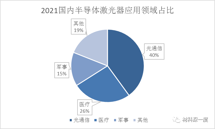 在半導體(ti) 激光器行業(ye) 下遊終端應用市場中,通信、醫療和軍(jun) 事都是最主要的應用領域,經過多年的發展,行業(ye) 下遊環節逐步形成了穩定的發展格局,目前通信領域所占的需求量較其他終端應用市場高,2021年市場占比達40%;其次為(wei) 醫療和軍(jun) 事應用領域分別占比26%和15%,除此之外其他廣泛應用的領域合計占比19%。