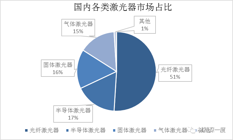 fun88官网平台器市場主要以光纖激光器為(wei) 主導,由於(yu) 光纖激光器性能優(you) 異,適用性較強,近十年市場份額快速提升,占比達51%。半導體(ti) 激光器、固體(ti) 激光器、氣體(ti) 激光器占比差距較小,占比分別為(wei) 17%、16%和15%。