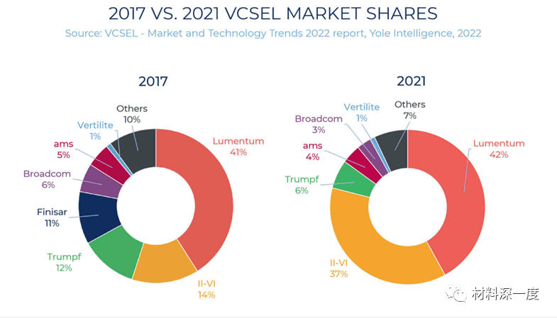 2017年以來,VCSEL市場是寡頭壟斷,Lumentum是當時蘋果唯一合格的供應商,主要由Lumentum主導。到2022年,Coherent(II-VI)收購了Finisar。Lumentum和II-VI這兩(liang) 家公司是獲得蘋果3D傳(chuan) 感資格的企業(ye) 。VCSEL變成了雙頭壟斷。Lumentum和Coherent現在是最大的市場擁有者,總計占有80%的VCSEL市場。