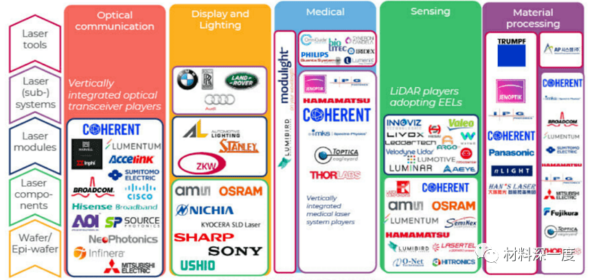EEL市場是高度分散的。大多數EEL製造商都是垂直整合的,即在內(nei) 部進行外延、前端線尾(FEOL)處理、包括與(yu) 激光二極管組件的圖樣相關(guan) 所有製程步驟,以及後端線尾(BEOL)製程,包括互連和封裝。邊發射激光器供應商有艾邁斯歐司朗、Coherent、Lumentum、Cisco、海信、長光華芯等企業(ye) ,下遊主要應用企業(ye) 包括光學通訊、顯示照明、醫療、傳(chuan) 感、和材料加工四大領域。