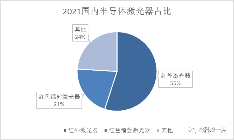 當前中國半導體(ti) 激光器市場主要以紅外激光產(chan) 品為(wei) 主導,相比其他類型的半導體(ti) 激光器產(chan) 品更受到下遊市場的青睞,截至2021年末,紅外激光器占整體(ti) 市場的比重超過一半,達55%左右,已經成為(wei) 最大的半導體(ti) 激光器品類,此外紅色鐳射激光器占據的市場份額排在其後,2021年同期市場占比約為(wei) 21%,其他種類的半導體(ti) 激光器產(chan) 品合計占有總市場的24%。