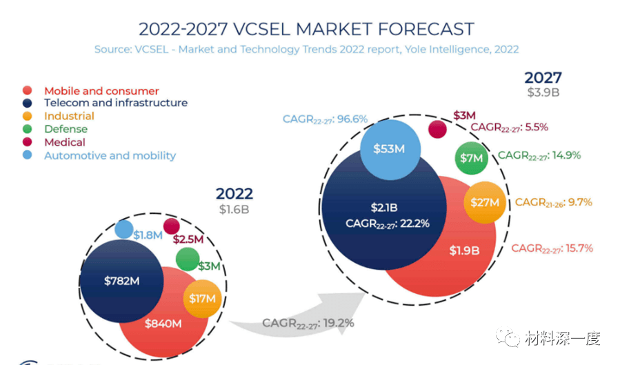 到2022年,VCSEL市場與(yu) 2018年相比幾乎翻了一番,yole預計將達到8.4億(yi) 美元。期間的年複合增長率(CAGR 2022-2027)為(wei) 19.2%。從(cong) 2023年開始,數據通信依然是VCSEL最大的市場,並在接下來的五年內(nei) 主導VCSEL市場。數據通信的VCSEL收入預計到2027年將達到21億(yi) 美元,而移動和消費者的VCSEL收入可能達到17億(yi) 美元。