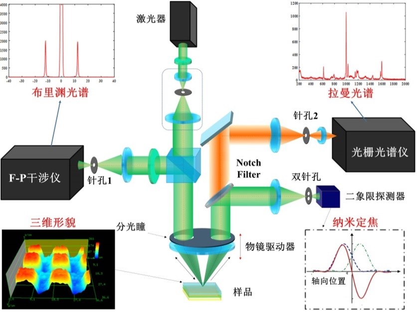 鑒於(yu) 此,該團隊在國家自然基金重點項目“機械形態性能激光分光瞳差動共焦布裏淵—拉曼光譜測量原理與(yu) 傳(chuan) 感係統(51535002)”等項目支持下,發明了圖1所示的高穩定、高分辨、抗散射分光瞳激光差動共焦拉曼-布裏淵(Divided-aperture Laser Differential Confocal Raman-Brillouin,DLDCRB)圖譜成像新方法(授權中國發明專(zhuan) 利ZL 201410086366.5和歐洲發明專(zhuan) 利EP 3118608 B1),該方法將分光瞳激光差動共焦顯微技術與(yu) 拉曼光譜和布裏淵光譜探測技術相結合,通過差動共焦測量技術進行納米精度的樣品定焦,來提高係統空間分辨力和穩定性;通過分光瞳斜向激發與(yu) 探測技術進行反射光和層間散射光等幹擾光的抑製,來提高係統的光譜探測信噪比;通過拉曼光譜與(yu) 布裏淵光譜的同源激光激發與(yu) 高分辨分離探測,來實現微區幾何形貌、拉曼光譜和布裏淵光譜的高穩定、高分辨原位圖譜成像。