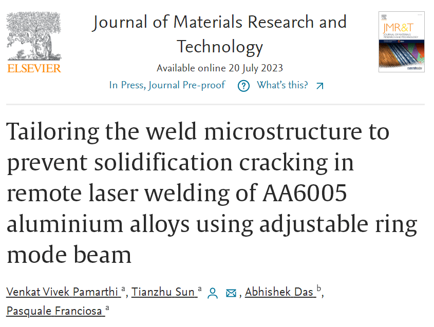 英國沃裏克大學、印度理工學院一組研究團隊采用可調環模式光束對AA6005鋁合金遠程激光焊接中焊縫微觀結構進行調整,防止凝固開裂。相關(guan) 研究成果以“Tailoring the weld microstructure to prevent solidification cracking in remote laser welding of AA6005 aluminium alloys using adjustable ring mode beam”為(wei) 題發表在《Journal of Materials Research and Technology》上。