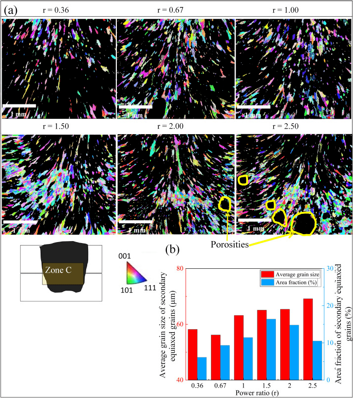 C區表現為(wei) 在熔合區底部形成二次等軸晶粒,觀察到其取向是隨機的。圖10 (a)示出了在平均晶粒尺寸為(wei) 30 μm到最大平均晶粒尺寸為(wei) 50 μm的晶粒上用濾光片配製的結晶圖。另一方麵,圖10 (b)總結了不同功率比下C區平均晶粒尺寸和二次等軸晶粒麵積分數的發展情況。這表明功率比的增加導致晶粒尺寸的輕微增大,但值得注意的是,在C區觀察到的晶粒比在A區觀察到的晶粒更細。