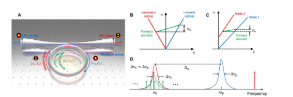 圖:雙域光纖激光器的工作原理。(A) TMF環形腔中基於(yu) 前向互調SBS的雙域(聲子和光子)激光器的示意圖。光纖中(B)後向SBS和(C)前向SBS的能量和動量守恒條件下的色散圖。(D) 在頻域中說明了同時產(chan) 生聲子和聲子激光的工作原理。來源:Science Advances (2023). DOI: 10.1126/sciadv.adg7841