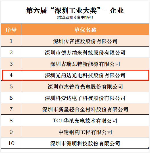 “深圳工業(ye) 大獎”被稱為(wei) “深圳工業(ye) 界奧斯卡”,每兩(liang) 年評選一次,旨在大力弘揚工業(ye) 精神,營造重視實體(ti) 經濟的社會(hui) 氛圍,表彰長期致力於(yu) 實體(ti) 經濟發展,振興(xing) 民族工業(ye) 的工業(ye) 家和工業(ye) 企業(ye) ,並形成與(yu) 中國工業(ye) 大獎對應體(ti) 係,是深圳工業(ye) 界的最高榮譽,其權威性受到業(ye) 內(nei) 外的廣泛認可。深圳光韻達光電科技股份有限公司榮獲第六屆“深圳工業(ye) 大獎"。 第六屆“深圳工業(ye) 大獎”入圍企業(ye) 及項目具有較強的生態主導力和核心競爭(zheng) 力,既有產(chan) 業(ye) 基礎的研發製造,也有前沿技術的攻堅突破。涵蓋先進製造業(ye) 為(wei) 主體(ti) 的戰略性新興(xing) 產(chan) 業(ye) 等多個(ge) 細分領域。 ▲獲“深圳工業(ye) 大獎”企業(ye) 名單截圖 02、什麽(me) 是“深圳工業(ye) 大獎” 深圳工業(ye) 大獎與(yu) 中國工業(ye) 大獎相伴而生。中國工業(ye) 大獎是經國務院正式批準設立的我國工業(ye) 領域最具影響力的獎項。深圳工業(ye) 大獎是由深圳工業(ye) 總會(hui) 、深圳商報聯合相關(guan) 行業(ye) 協會(hui) 和機構聯合舉(ju) 辦,從(cong) 深圳實際出發,專(zhuan) 門設立與(yu) 中國工業(ye) 大獎形成對應體(ti) 係的深圳工業(ye) 領域的最高獎項,同時也是與(yu) “香港工業(ye) 大獎”比肩而立的大灣區工業(ye) 界的重要獎項。旨在表彰長期致力於(yu) 工業(ye) 經濟發展並做出卓著貢獻的工業(ye) 家和工業(ye) 企業(ye) 。在全社會(hui) 大力弘揚重視實體(ti) 經濟、實業(ye) 興(xing) 國的正確理念,喚起負責任的工業(ye) 企業(ye) 和工業(ye) 家擔負起引導工業(ye) 健康發展的曆史使命,激勵深圳工業(ye) 界爭(zheng) 先創優(you) ,樹立工業(ye) 標杆,以發揮深圳工業(ye) 企業(ye) 在“雙區”建設中的重要作用。 03、什麽(me) 樣的企業(ye) 能獲獎 獎項要求企業(ye) 主要工業(ye) 經濟指標在國內(nei) 同行業(ye) 居領先地位,並且擁有關(guan) 鍵核心技術和自主知識產(chan) 權,自主創新能力居行業(ye) 領先水平,能紮實推進品牌戰略。企業(ye) 的市場競爭(zheng) 力強,能做到“三積極”:積極推進工業(ye) 化與(yu) 信息化融合;積極履行產(chan) 品質量擔保責任,誠信水平高;積極履行社會(hui) 責任,社會(hui) 認同度高,對行業(ye) 、地區和企業(ye) 發展具有示範和帶動作用。