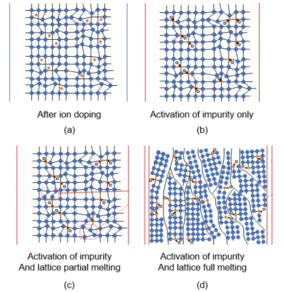 活化過程的機製可以通過分析吸收激光能量後雜質的釋放和再結晶來解釋,如圖6所示。結果表明,在不同能量的激光照射下,矽薄膜電阻的變化與(yu) 晶體(ti) 狀態的變化是一致的。在圖3中,第一次減少可能是由於(yu) 雜質的釋放而不改變晶格。激光輻照功率越大,雜質釋放量越大,薄片電阻越低。在所有雜質釋放後,釋放量沒有增加,因此阻力首先飽和。當激光功率進一步提高時,矽晶體(ti) 部分熔化再結晶,熔化導致晶格缺陷,載流子遷移率下降,導致片電阻增大。隨著激光輻照能量的增加,合金的熔融再結晶率和晶粒尺寸逐漸增大,最終達到完全熔融和再結晶後的側(ce) 向結晶。遷移率隨晶粒尺寸的增大而增大,薄片電阻隨激光能量的增大而減小。遷移率在橫向區域飽和,因此薄片電阻飽和。