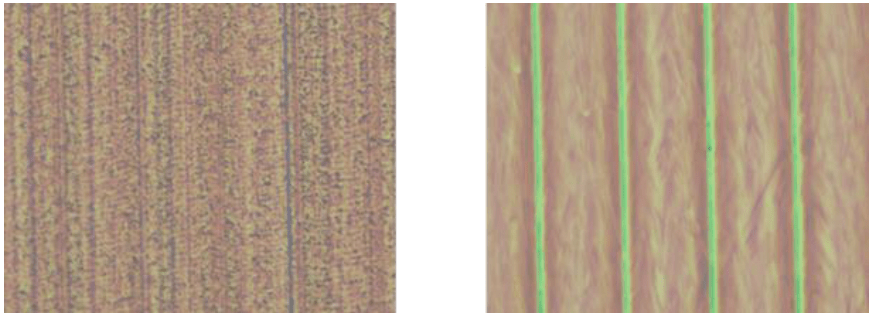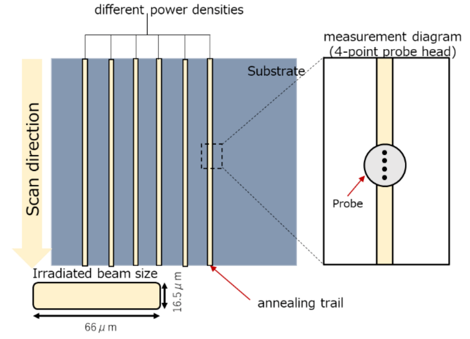 圖2顯示了激光束形狀、用於(yu) 表麵電阻測量和四針電阻測量的條帶。采用HIOKI 3239 DIGITAL HiTESTER進行電阻測量。