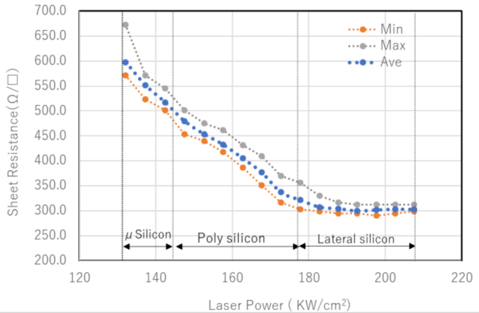 實驗中改變激光功率,研究薄片電阻與(yu) 激光功率的關(guan) 係如圖3所示。當激光功率增大時,薄片電阻先減小,然後略有增大,再減小,最後達到飽和。使用常規RTA的樣品的薄片電阻約為(wei) 20 KΩ/sq。飽和區片材電阻約為(wei) 7 KΩ/sq。它被還原了2/3。這可能有助於(yu) 顯著改善TFT的通流能力。