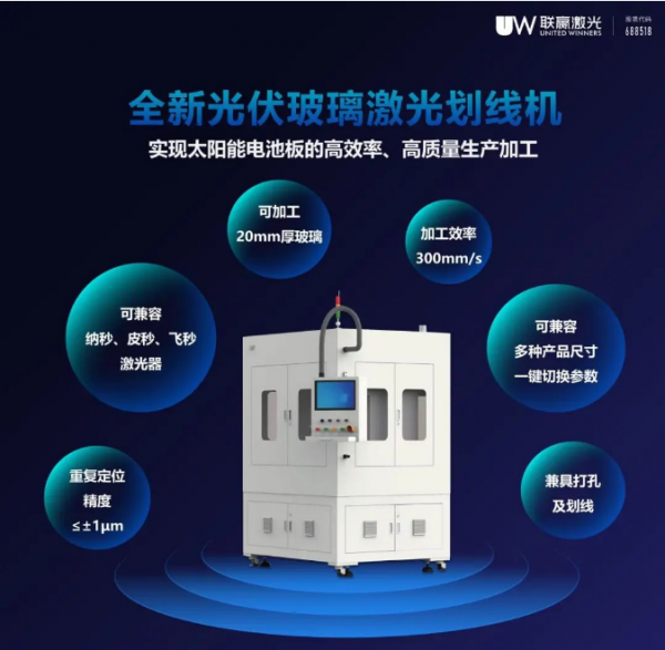 聯贏激光展會(hui) 現場 能源轉型新時代下,光伏儲(chu) 能產(chan) 業(ye) 在新能源消費與(yu) 應用領域中的重要性與(yu) 經濟性進一步得到強調,並成為(wei) 未來能源產(chan) 業(ye) 競爭(zheng) 的最火賽道。 高精度激光劃線 是鈣鈦礦電池量產(chan) 線的核心製程 鈣鈦礦太陽能電池是以鈣鈦礦晶體(ti) 為(wei) 吸光材料的一種新型太陽能電池技術,可實現30%以上的光電轉換效率,其兼備高效率和低成本以及對環境造成的影響較小等特點,被認為(wei) 是極具潛力的高效率低成本光伏技術之一。 光伏玻璃是製造太陽能光伏電池組件必不可少的重要原材料,主要用於(yu) 光伏組件的透光麵板,覆蓋在光伏組件上的光伏玻璃經過鍍膜後,可以確保有更高的光線透過率,同時經過鋼化處理的光伏玻璃具有更高的強度,可以使太陽能電池片承受更大的風壓及較大的晝夜溫差變化。 常規的光伏電池組件蓋板使用光伏玻璃,雙玻組件的蓋板和背板都使用光伏玻璃,且背板光伏玻璃必須在特定位置打孔才能把光伏電池組件的電流導線引出到接線盒。 激光劃線是通過激光將整片電池分割成一定大小數量的子電池,並形成串聯結構。激光劃線速度、效率、良率更高,相比較於(yu) 機械劃線而言不會(hui) 因為(wei) 熔渣而造成短路。另外,激光劃線是非接觸式加工的方式,不會(hui) 對基材造成損傷(shang) ,特別是P1、P2、P3襯底的材質、硬度、厚度等都有不同,激光劃線優(you) 勢更加明顯。 當下,高精度激光劃線是大幅麵鈣鈦礦電池量產(chan) 線的核心製程之一,且對於(yu) 電池死區麵積控製極為(wei) 重要。該工序要求在形成子電池串聯結構的同時,對不同膜層在不同的位置進行刻蝕,對激光工藝、係統穩定性和精度要求極高。 重磅展品 光伏玻璃激光劃線機 聯贏激光全新上市的光伏玻璃激光劃線機,同時兼具打孔、劃線工序,進一步簡化工藝流程,實現快速、精確和一致的激光打孔及劃線,避免產(chan) 生微裂紋和剝落碎屑的問題,提高產(chan) 量,降低次品率;另外,無需額外的工藝步驟和化學物質,具有高精度、高效率和非接觸式的特點,實現太陽能電池板高效率、高質量、低成本生產(chan) 加工。