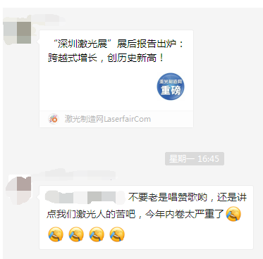 真的苦,相信激光人近幾年日子都不太好過。在我們(men) “fun88网页下载”小編外出采訪的時候,私底下也常聽到一些“訴苦”,譬如:“技術仿製,行業(ye) 內(nei) 同質化嚴(yan) 重”、“國際市場萎縮嚴(yan) 重”、“價(jia) 格戰的惡性競爭(zheng) 嚴(yan) 重”……等等,因為(wei) 這種種原因,“今年內(nei) 卷太嚴(yan) 重了!”甚至有的激光企業(ye) 推出新產(chan) 品後拒絕媒體(ti) 廣告宣傳(chuan) ,理由是推出新產(chan) 品後,悄悄賣還能賣上一段時間,悶聲發點小財,如果廣而告之,短時間內(nei) ,別的企業(ye) 就會(hui) 跟風仿製出同類產(chan) 品,競爭(zheng) 便隨之而來……