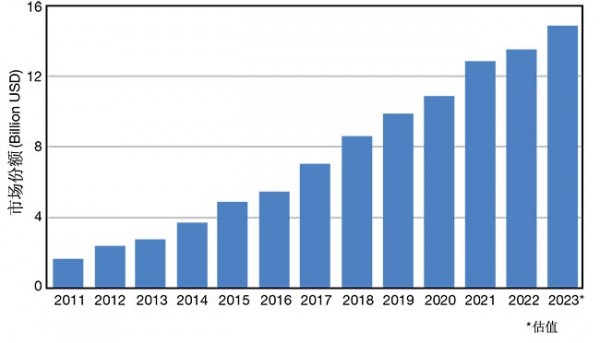 圖1:2011-2023年fun88官网平台市場增長示意圖。2022年中國工業(ye) 激光市場達到135億(yi) 美元,年增長率為(wei) 5%。