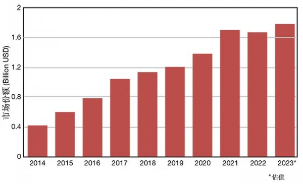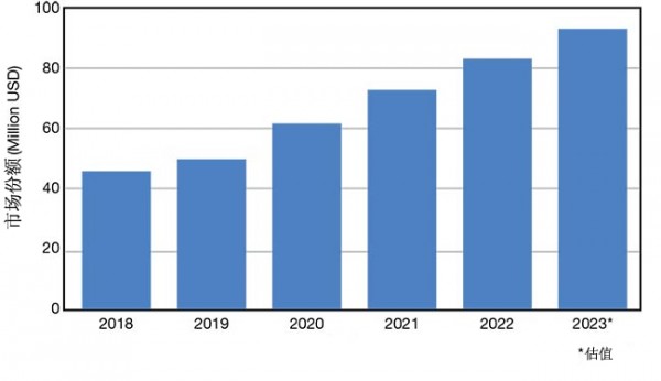 由於(yu) 光纖激光器和直接二極管激光器的成本較低,在2022年,我國激光清洗市場出現了快速增長,市場總額達到8300萬(wan) 美元,預計2023年將達到9300萬(wan) 美元左右(圖9)。
