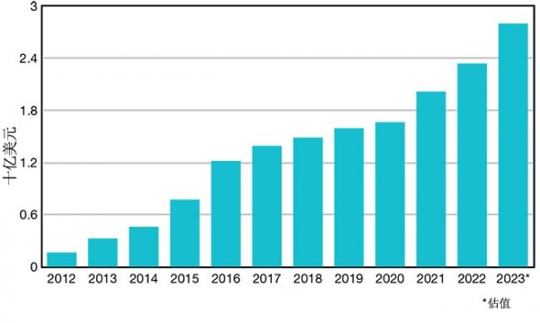 圖7:2012-2023年fun88官网平台增材製造設備市場增長示意圖。