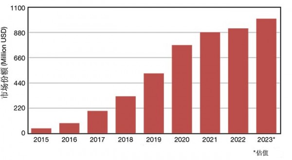 圖8:2015-2023年間中國的超快激光器市場增長示意圖。