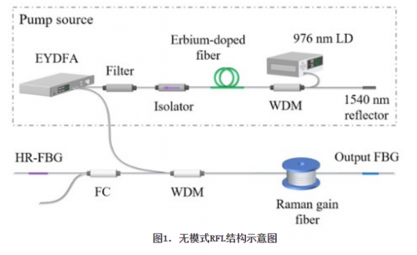 無模式RFL的結構如圖1所示。為(wei) 了避免由泵浦源向拉曼激光的相對強度噪聲傳(chuan) 遞,泵浦源采用實驗室自行搭建的ASE光源,中心波長1540nm,最大輸出功率10.3 W。輸出光柵采用一個(ge) 超低反FBG,反射率為(wei) -27 dB。