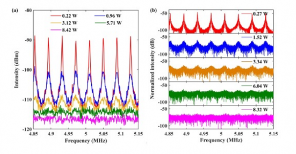 研究團隊利用廣義(yi) 非線性薛定諤方程對拉曼光纖激光器中光場隨激光輸出功率的演變進行了模擬,得到RFL的射頻譜如圖2(b)所示。仿真結果顯示,周期性的拍頻峰隨著功率的增加逐漸消失,與(yu) 實驗測量結果基本一致。