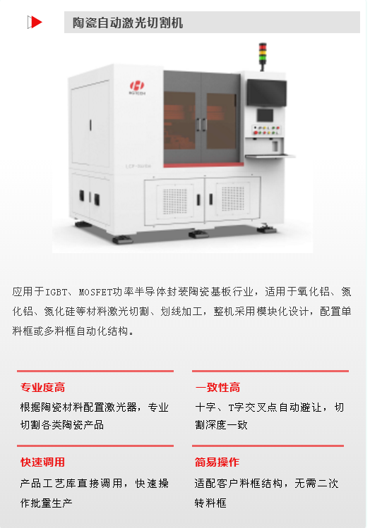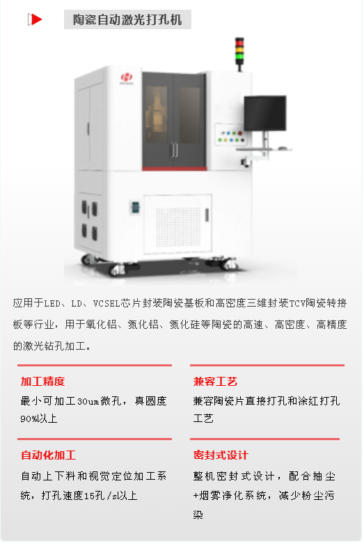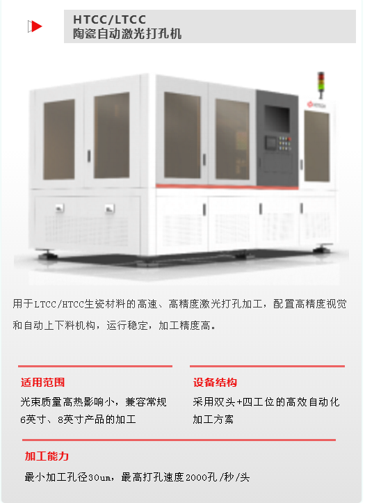 陶瓷載板已成為(wei) 大功率電力電子電路結構技術和互連技術的基礎材料,廣泛用於(yu) 高端電路板市場。華工激光圍繞陶瓷片、陶瓷基板的da孔、切割、檢測等工藝流程開發係列解決(jue) 方案。