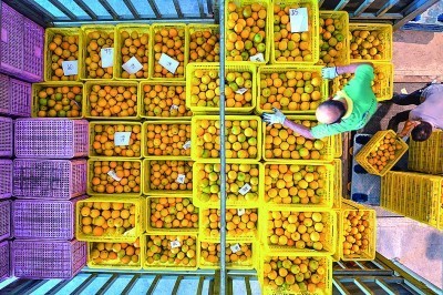在湖北秭歸縣臍橙文旅小鎮數字化電商中心,工作人員將夏橙裝車。新華社發