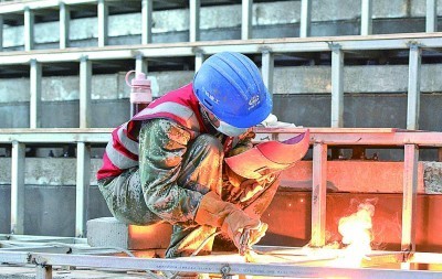 工人在北京城市副中心圖書(shu) 館項目施工現場施工。新華社發
