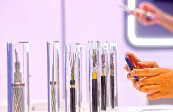 長飛光纖光纜股份有限公司生產(chan) 車間,正在通過預製棒來拉絲(si) 光纖。記者周超 攝