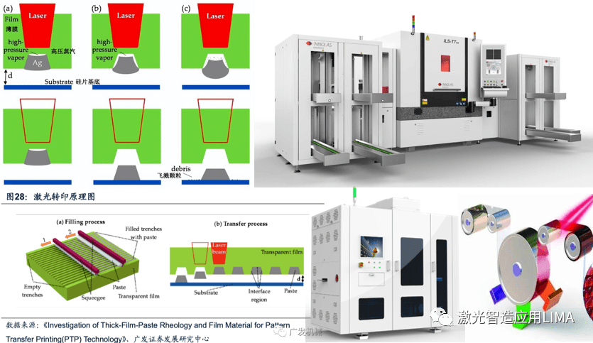 激光圖形轉印技術(Pattern Transfer Printing,簡稱:PTP)是一種新型的非接觸式的印刷技術,該技術原理是在特定柔性透光材料上塗覆所需漿料,采用高功率激光束高速圖形化掃描,將漿料從(cong) 柔性透光材料上轉移至電池表麵,形成柵線。通過非接觸激光印刷技術(PTP)改善高效太陽能電池細柵印刷工藝,能夠突破傳(chuan) 統絲(si) 網印刷的線寬極限,輕鬆實現 25um 以下的線寬,在電池片矽片上印刷更大高寬比的超細柵線,幫助電池實現超細密柵電池,匹配選擇性發射極技術,提升太陽能電池效率的同時,大幅度節省漿料耗量20%以上,最終降低電池生產(chan) 、發電成本。激光轉印技術的原理基於(yu) 激光的高能量密度和精確控製。其主要步驟包括:1、底層準備:在太陽能電池的製造過程中,底層通常是透明導電層,用於(yu) 收集太陽能並傳(chuan) 輸電流。2、激光照射:使用激光光束照射在底層上,以精確控製的方式移動激光焦點。激光的高能量密度可以選擇性地燒結或劃傷(shang) 底層,以形成電池的特定模式。3、層疊:不同的電池層,如活性層和電極,可以通過激光轉印逐層疊加到底層上。4、成型和封裝:最後,電池組件通過成型和封裝步驟進行加工,形成最終的太陽能電池。它的優(you) 勢在於(yu) :1、高精度:激光轉印技術能夠實現極高的精度和分辨率,有助於(yu) 生產(chan) 高效率的太陽能電池,印刷高度一致性、均勻性優(you) 良,誤差在2um,低溫銀漿也同樣適用(HJT)。2、非接觸性:這是一種非接觸性加工方法,不會(hui) 損壞或汙染電池組件,有助於(yu) 提高電池的質量,並且在未來的薄片化的進程中肯定鋒芒畢露。3、快速生產(chan) :激光轉印是一種高速加工方法,可以提高太陽能電池的生產(chan) 效率。4、多材料適應性:這項技術可以應用於(yu) 多種不同類型的電池材料,包括有機材料、矽材料等。5、成本控製:比較絲(si) 網印刷,激光轉印的柵線更細,可以做到18um以下漿料節省30%,TOPCON的雙麵銀漿、HJT低溫銀漿都會(hui) 由於(yu) 激光轉印技術減少大量的銀漿消耗成為(wei) 降本增效的重要技術之一。