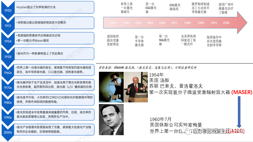 從(cong) 最初的實驗室應用到今天的醫學、通信、製造、軍(jun) 事和科學研究等各個(ge) 領域,激光已經成為(wei) 現代技術和科學的不可或缺的一部分。激光的起源可以追溯到20世紀中葉,主要是由亞(ya) 瑟·朗伯(Arthur Schawlow)和查爾斯·湯斯(Charles Townes)的理論研究和戴斯特·R·漢斯奇(Theodore Maiman)的實驗工作共同推動的。以下是更詳細的激光起源過程: