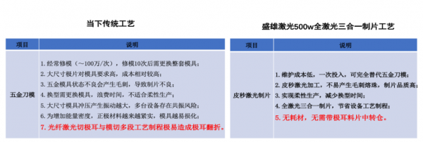 細分來看,疊片電芯的製片工藝包括:光纖激光/五金模具切割極耳、五金模具切割V角和五金模具裁斷料區等,切割的方式來自其他行業(ye) 的橫向遷移。但是,傳(chuan) 統的製造方法會(hui) 出現極耳翻折、隔膜褶皺、毛刺,以及模具消耗大等痛點。