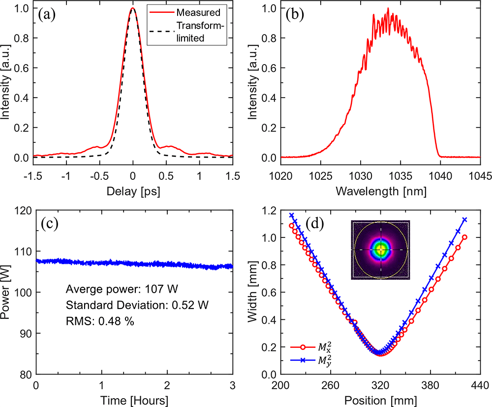 圖2. 單脈衝(chong) 1.07 mJ時的(a)自相關(guan) 曲線,(b)光譜分布,(c)功率穩定性和(d)光束質量結果