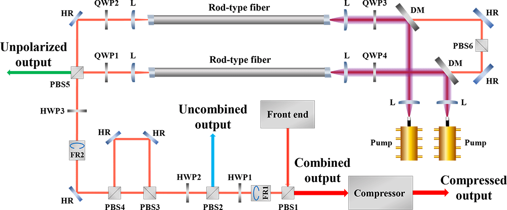 使用相幹合成技術,通過將多路放大後的飛秒脈衝(chong) 合在一起,是獲得高平均功率、毫焦量級飛秒脈衝(chong) 的可行方案。相幹合成分主動相幹合成和被動相幹合成兩(liang) 種,主動相幹合成的功率和能量可隨著合成路數的增加而不斷提升,但是需要複雜和昂貴的電控鎖定係統;而被動合成無需電控相位穩定器件,裝置較為(wei) 簡單,但受合成路數的限製,合成平均功率及單脈衝(chong) 能量低。