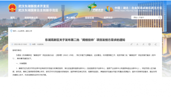 近日,湖北武漢東(dong) 湖新技術開發區公布了2023年第二批“揭榜掛帥”項目發榜方需求通知。此次“揭榜掛帥”共發布需求項目55項,包括6項重大成果轉換類、26項核心技術攻關(guan) 類、23項技術轉移應用類,共涉及研發總金額2.233億(yi) 元,擬付揭榜經費5028.4萬(wan) 元。其中激光光學類有10個(ge) 項目,涉及投入研發金額3990萬(wan) 元,擬付揭榜經費1010萬(wan) 元。