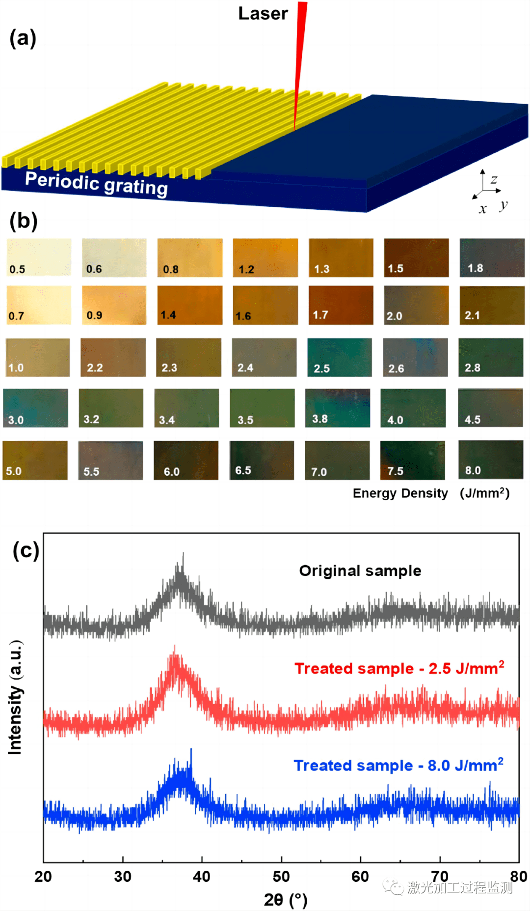 圖5.(a)激光加工周期性表麵光柵結構的三維示意圖,(b)能量密度變化與(yu) 顏色變化的關(guan) 係示意圖,(c)未處理、2.5J/mm2和8.0J/mm2處理的XRD圖譜。