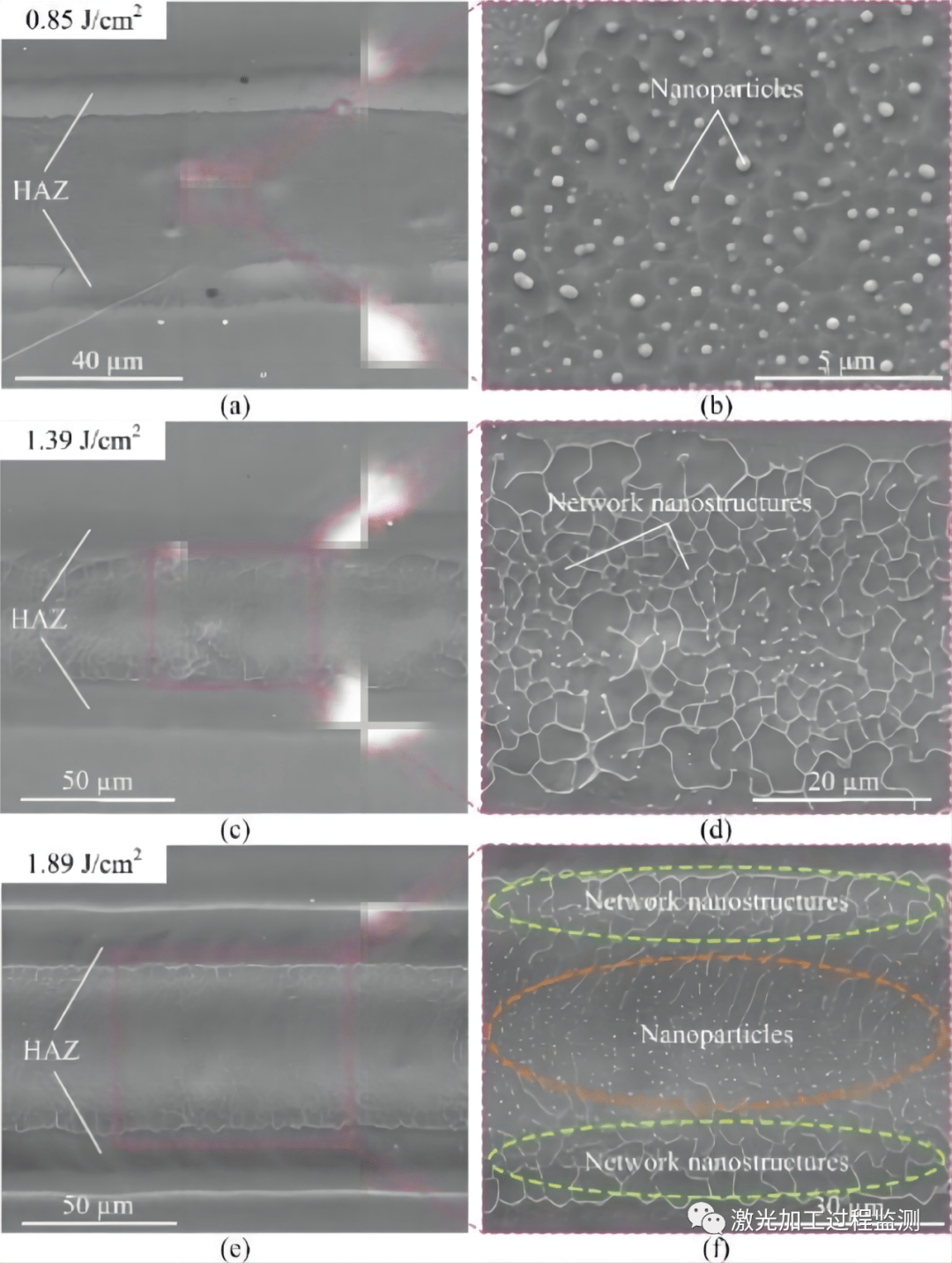 圖13.不同激光能量密度下激光照射後鐵基MG表麵的SEM形貌:(a、b)0.85J/cm2、(c、d)1.39J/cm2和(e、f)1.89J/cm2