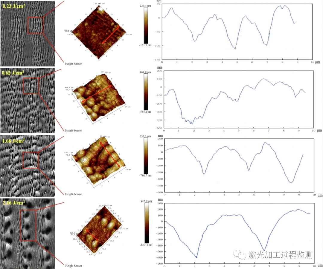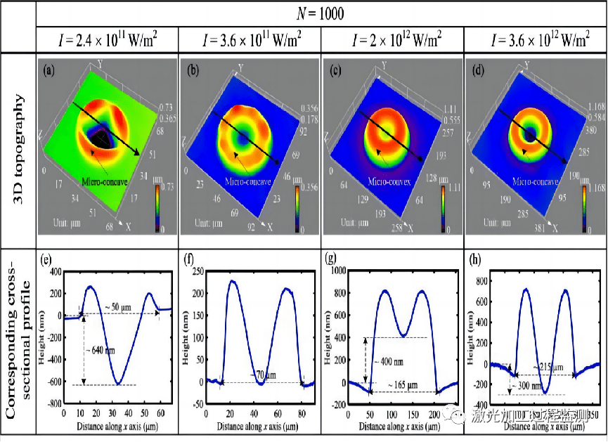 圖10.在各種峰值激光功率強度下獲得的激光燒蝕區域的3D拓撲,(e)–(h)為(wei) 圖3(a)–(d)中標記線的橫截麵剖麵圖,實驗的激光脈衝(chong) 數量均為(wei) 1000。