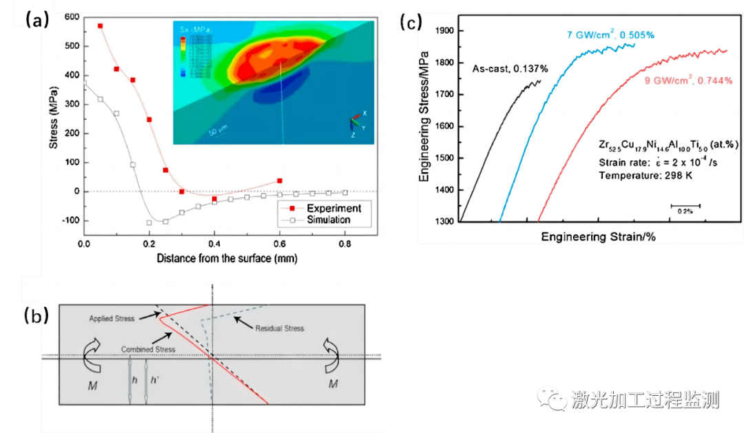 圖14.(a)激光處理BMG棒材表麵殘餘(yu) 應力的模擬和(b)彎曲過程中力的示意圖,(c)不同激光強度處理樣品的應力應變曲線,曲線右側(ce) 出現斷裂。