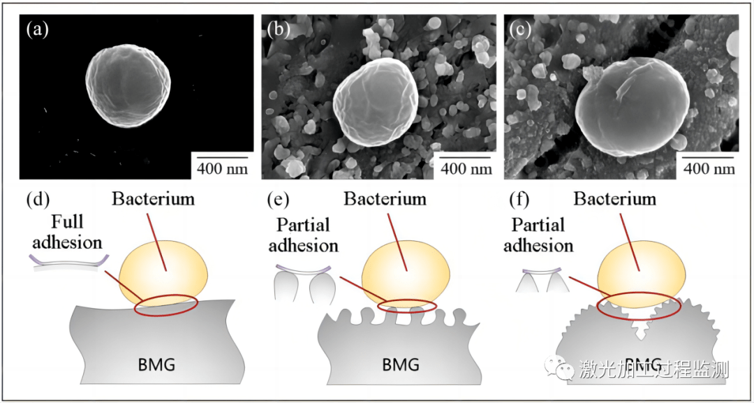 圖8.金黃色葡萄球菌在(a)拋光表麵、(b)納米顆粒結構表麵和(c)LIPSS上的表麵接觸狀態。表麵細菌粘附狀態示意圖(d)在拋光表麵上,(e)在納米結構表麵上和(f)在LIPSS上。