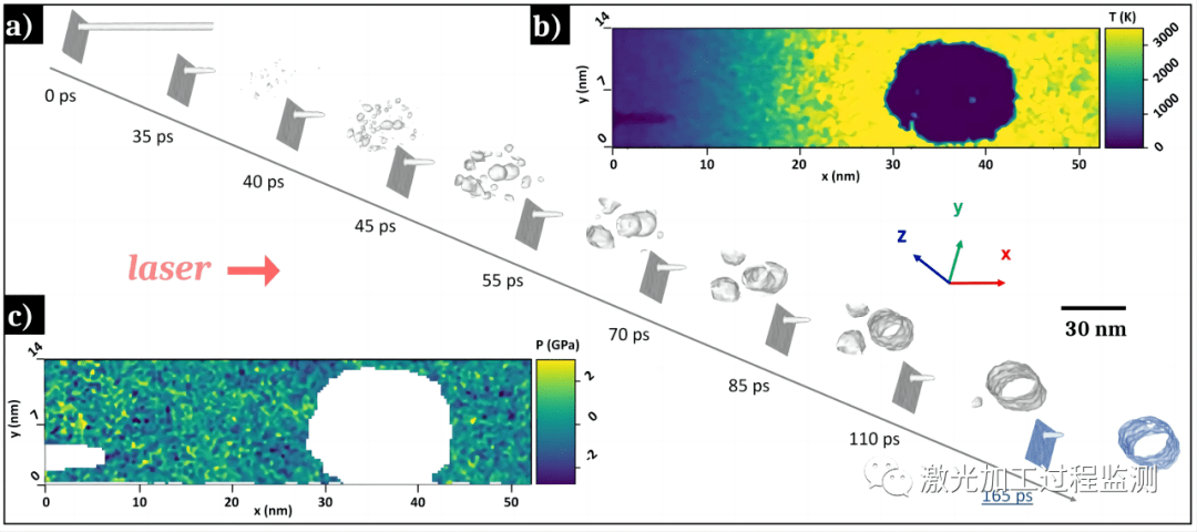 圖1.分子動力學模擬顯示了超短激光照射下Zr-Cu金屬玻璃表麵納米空腔的發展,峰值能量F=0.06J/cm2和一次激光射擊。輻照模擬開始後165ps納米孔周圍溫度和c壓力的演變。