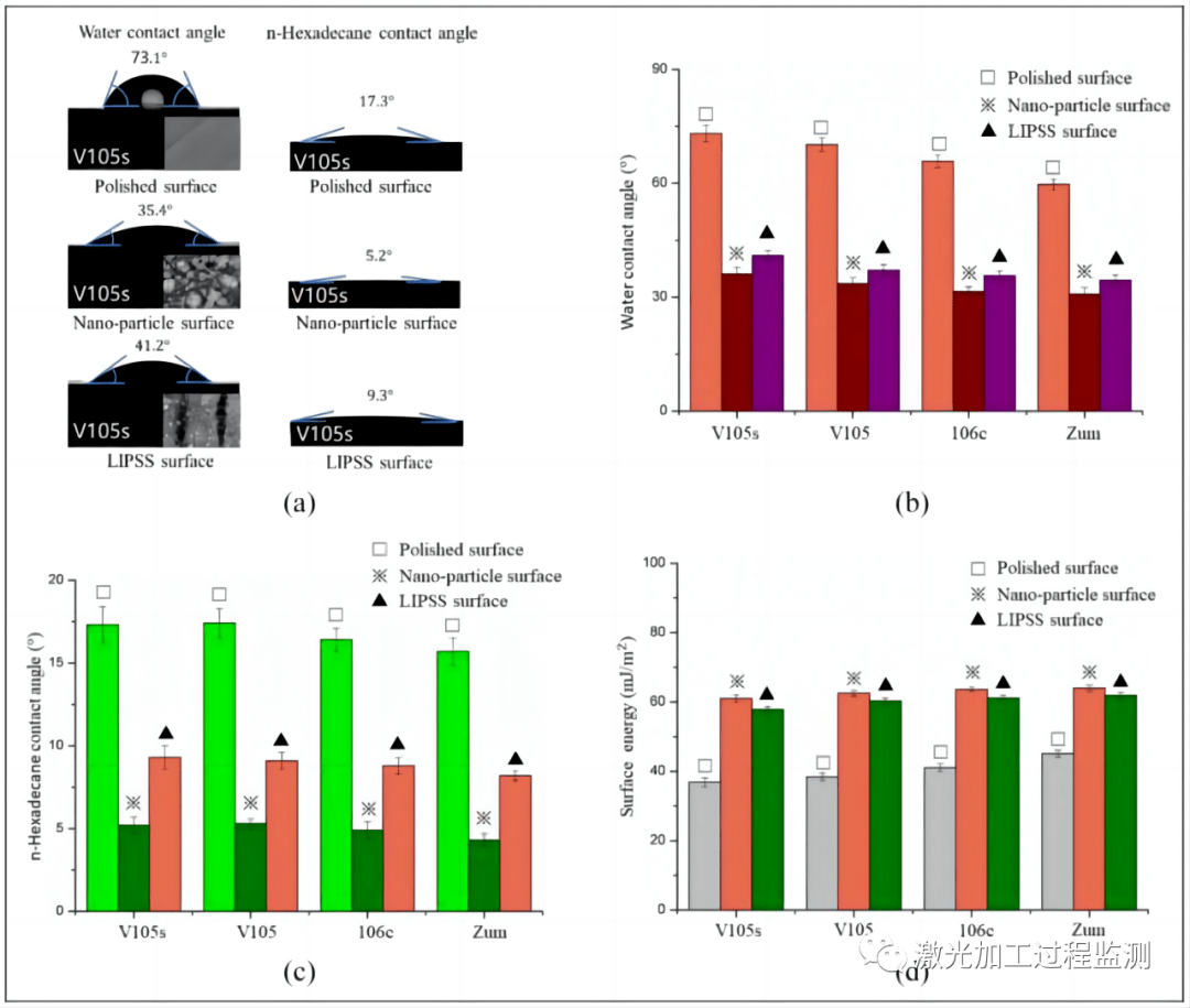圖7.(a)不同結構V105s表麵的接觸角變化,(b)試樣的水接觸角變化,(c)正十六烷試樣的接觸角變化,(d)試樣的表麵能變化;誤差條表示基於(yu) 每個(ge) 樣本不同區域的三個(ge) 測量值的標準偏差。