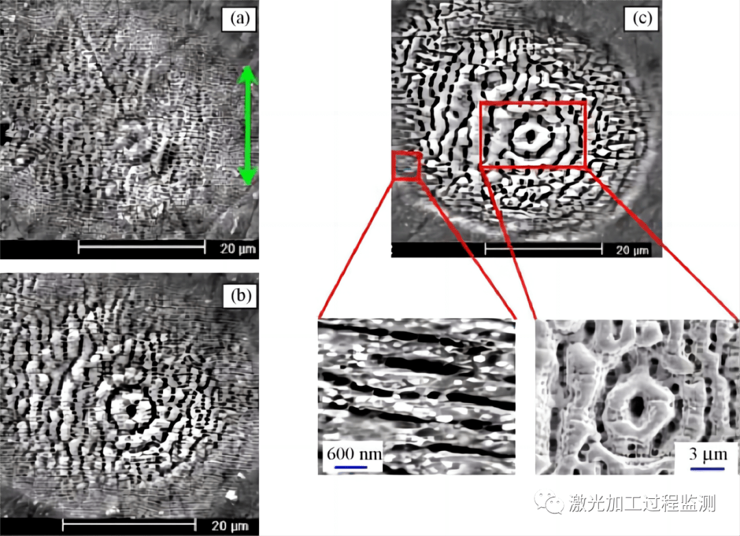 圖4.多脈衝(chong) 飛秒激光器在0.18J/cm2的低能量通量下照射的樣品的表麵形態.(a)N=10,(b)N=30和(c)N=100。